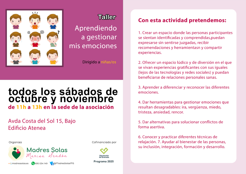 Nuestra Asociación ha sido beneficiaria con la subvención concedida por la Diputación de Granada que va a cofinanciar el Taller dirigido a niños-as » Aprendiendo a gestionar mis emociones».